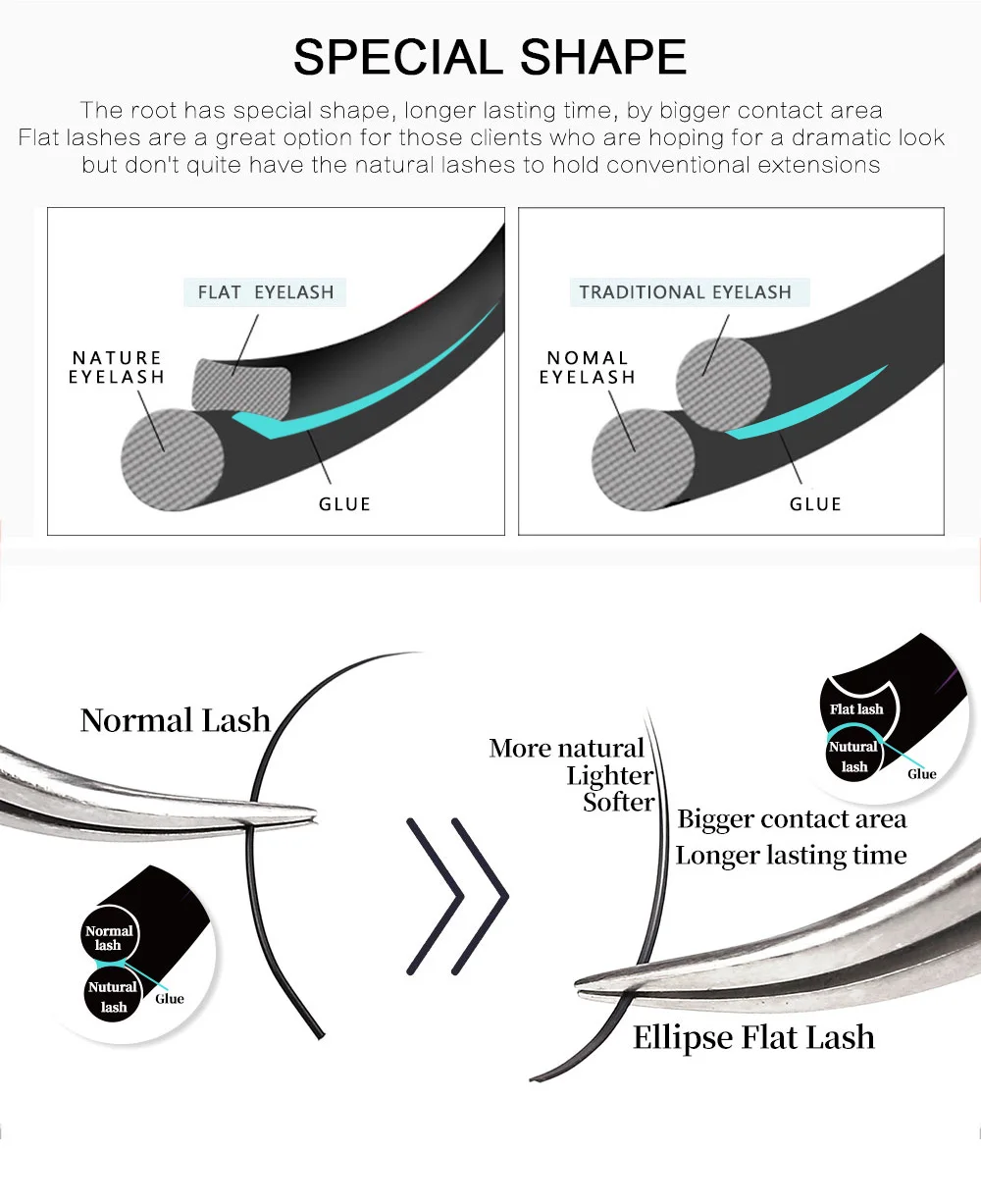 Flat lashes can be created using LESS weight- Ellipse/flat lashes are PERFECT for those clients who love the dramatic look, as their wider shape adds density & drama. For example, a 0.25 Ellipse lash weighs the same as a 0.15 regular lash extension!