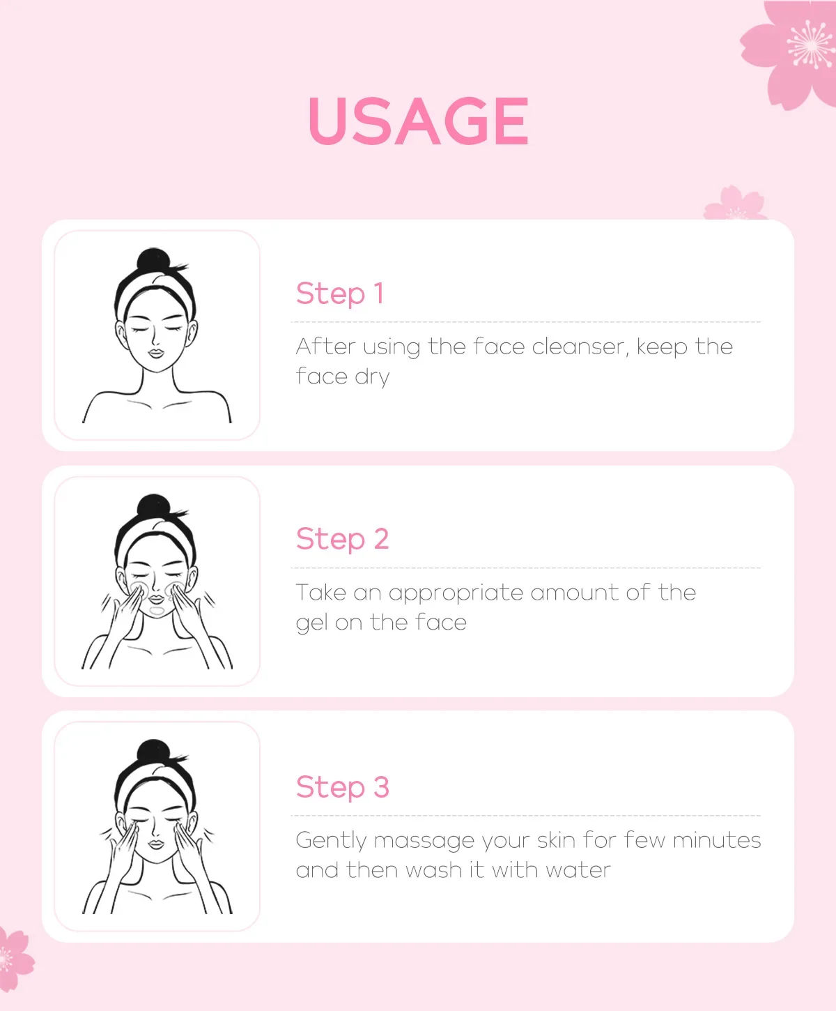 Take an appropriate amount of the gel, apply it to your face and body skin. Massage your skin for a while and wash with water.