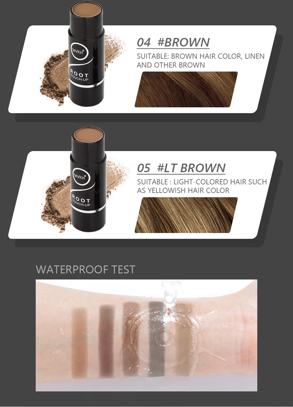Instant temporary haircolor for light, dark or gray roots