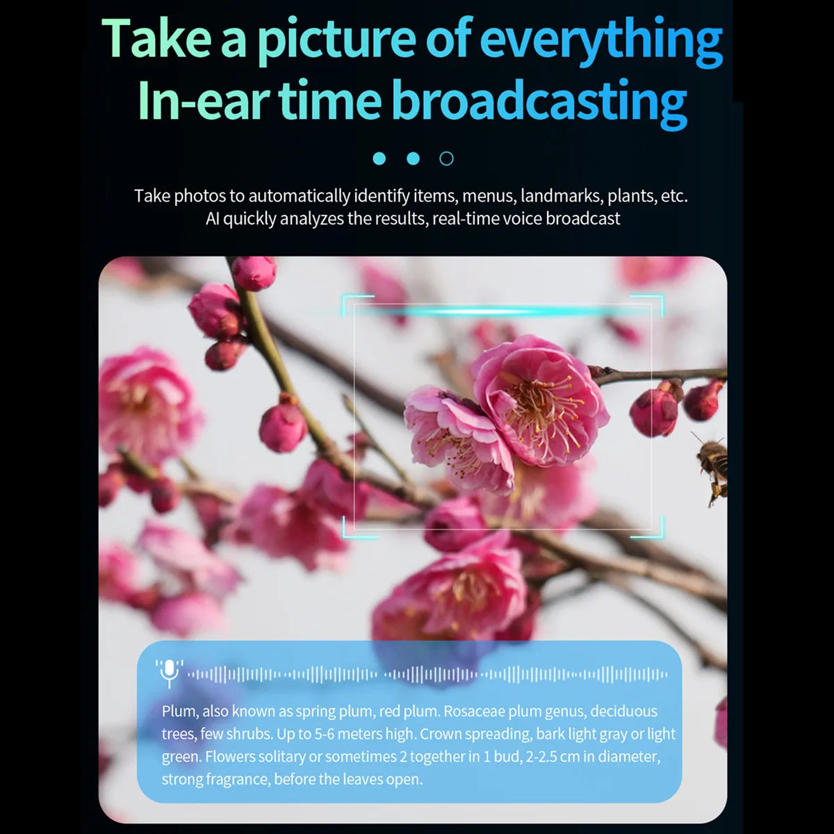 800W pixel camera, recording, voice wake-up, music playback, music control, making and receiving phone calls, shooting, connecting to Chat GPT large models, viewing real objects, real-time translation, etc., anti shake shooting, WiFi transmission, dual microphone noise reduction, sliding touch, wearing detection, etc.