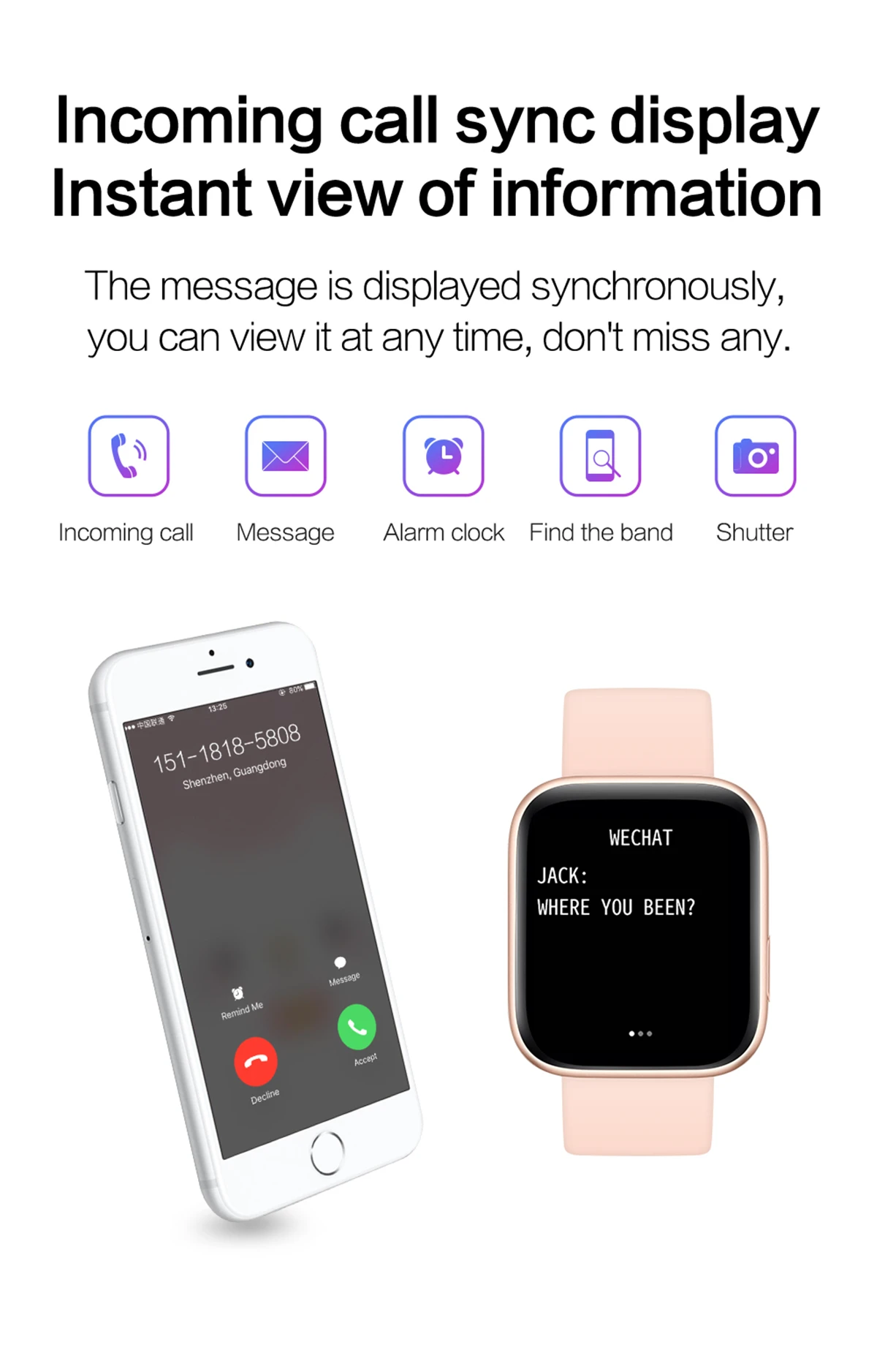 *Dial selection, message push, daily alarm, camera control, weather information, WeChat movement