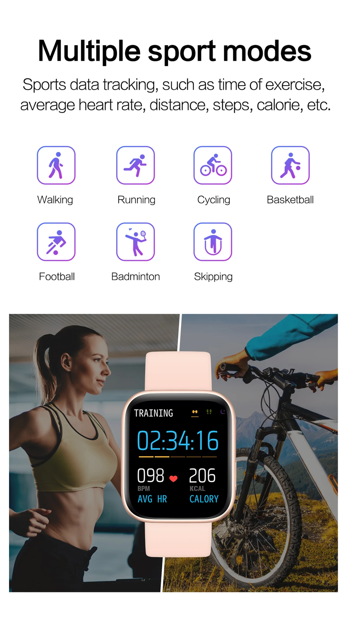 Sports recording (pedometer, distance, calorie counting), sports mode, message push, information storage, heart rate monitoring, sleep monitoring, blood pressure monitoring, blood oxygen saturation monitoring, stopwatch, camera control, music control, full font language, 1.4-inch color touch screen display