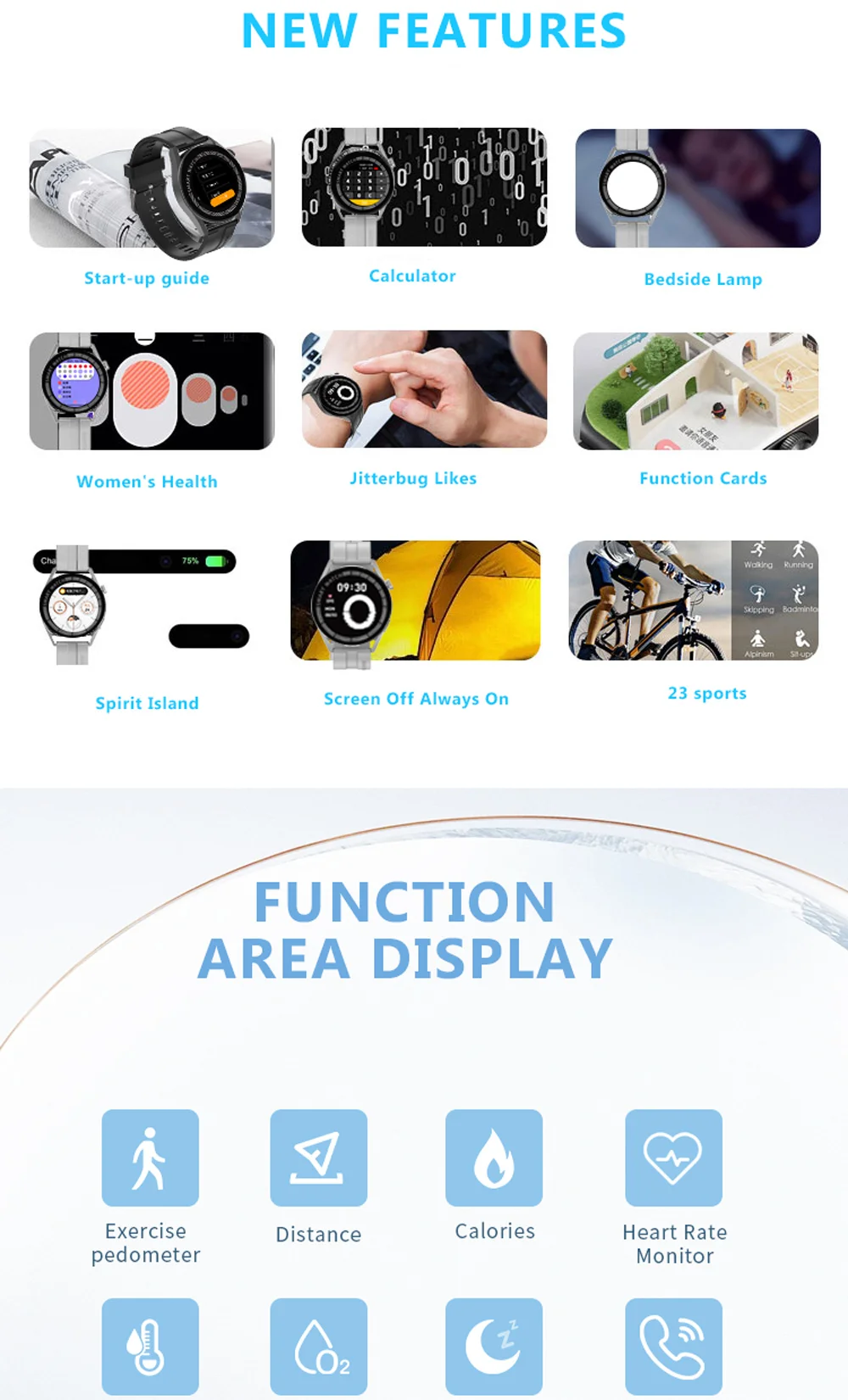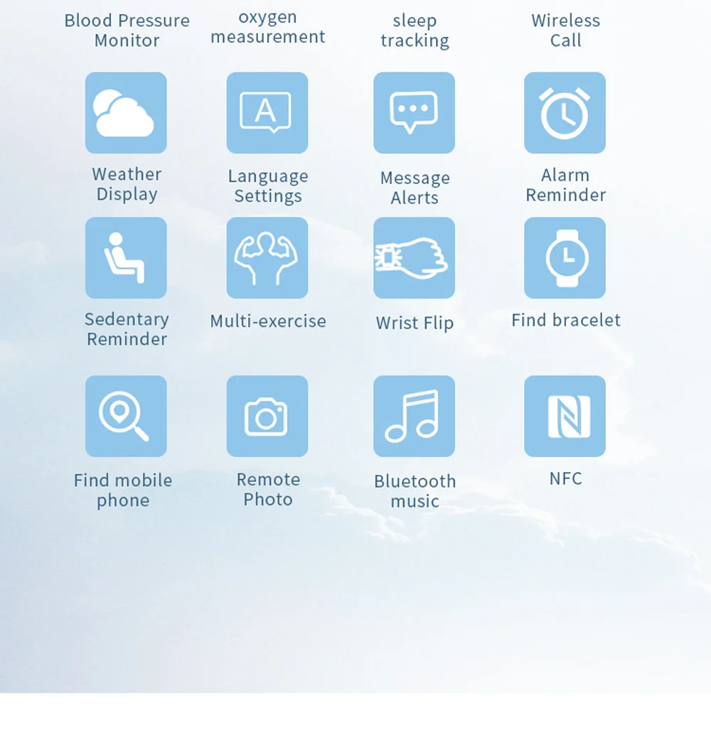 Daily activity monitoring, call reminders, message reminders, social app notifications, information push, custom watch faces, heart rate monitoring, blood pressure monitoring, blood oxygen monitoring, ECG monitoring, sleep monitoring, breathing training, water drinking reminders, sedentary reminders, women's health, Bluetooth voice calls, watch dial, sync phone contacts, call logs, music control, NFC applications, raise to wake, one-click Bluetooth connection, weather, stopwatch, calculator, alarm clock, scene modes, Bluetooth photography, find watch, find phone, password lock, calendar, flashlight, brightness adjustment, backlight off time, time settings, language settings, startup guide, bedside lamp, always-on display, factory reset.