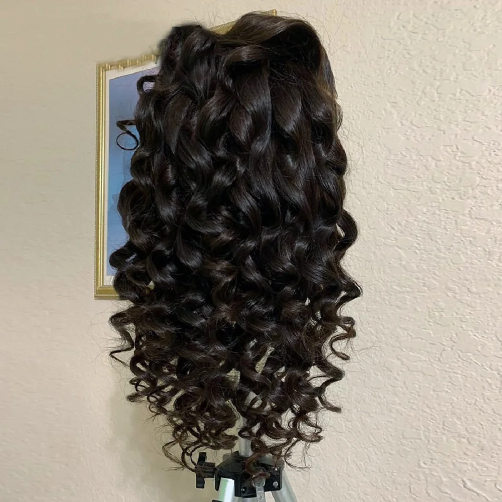 Soft Black Preplucked Soft 26“Long Deep Wave 180Density Lace Front Wig Synthetic For Women Heat Resistant Glueless Daily