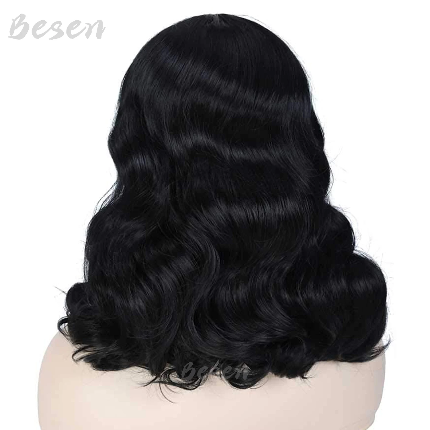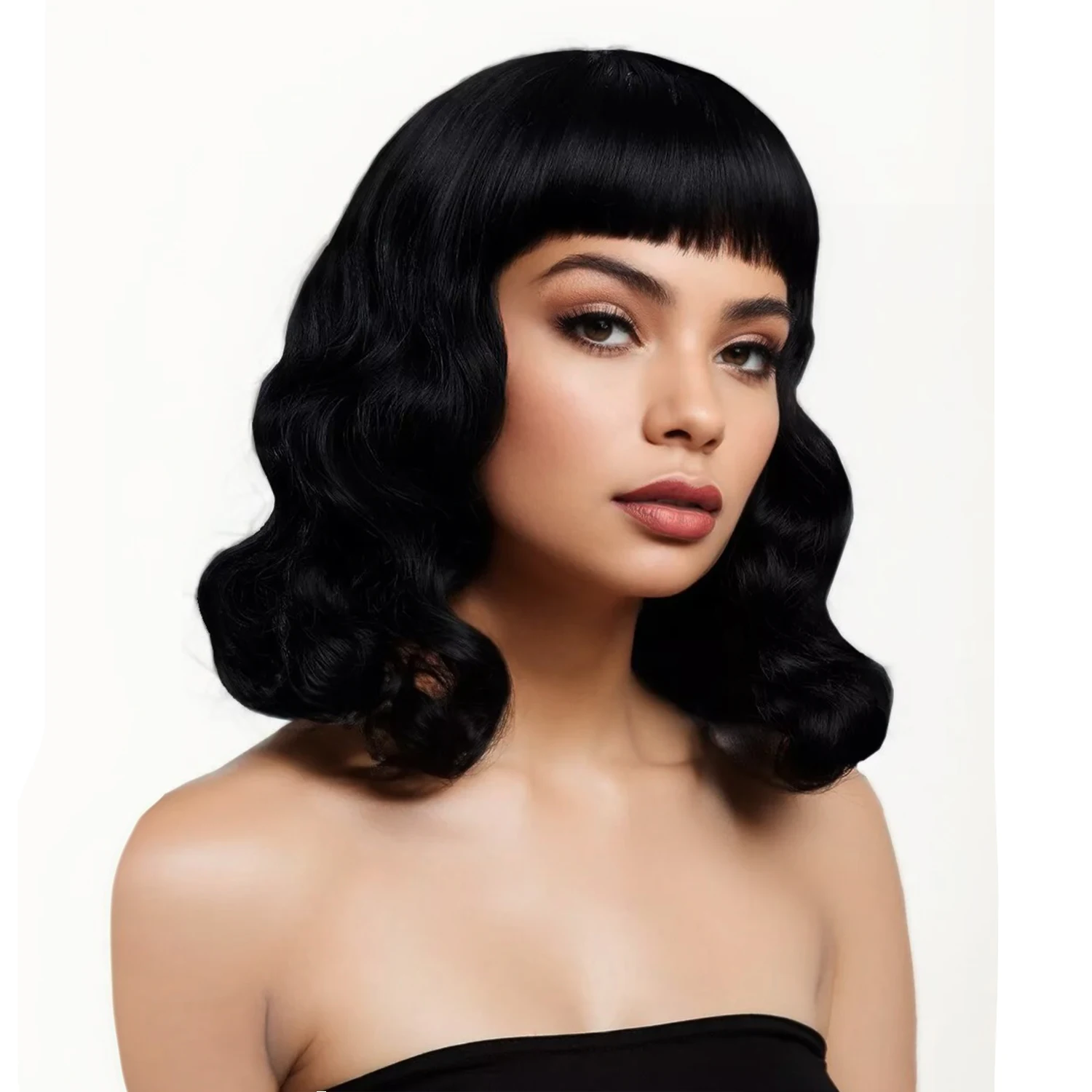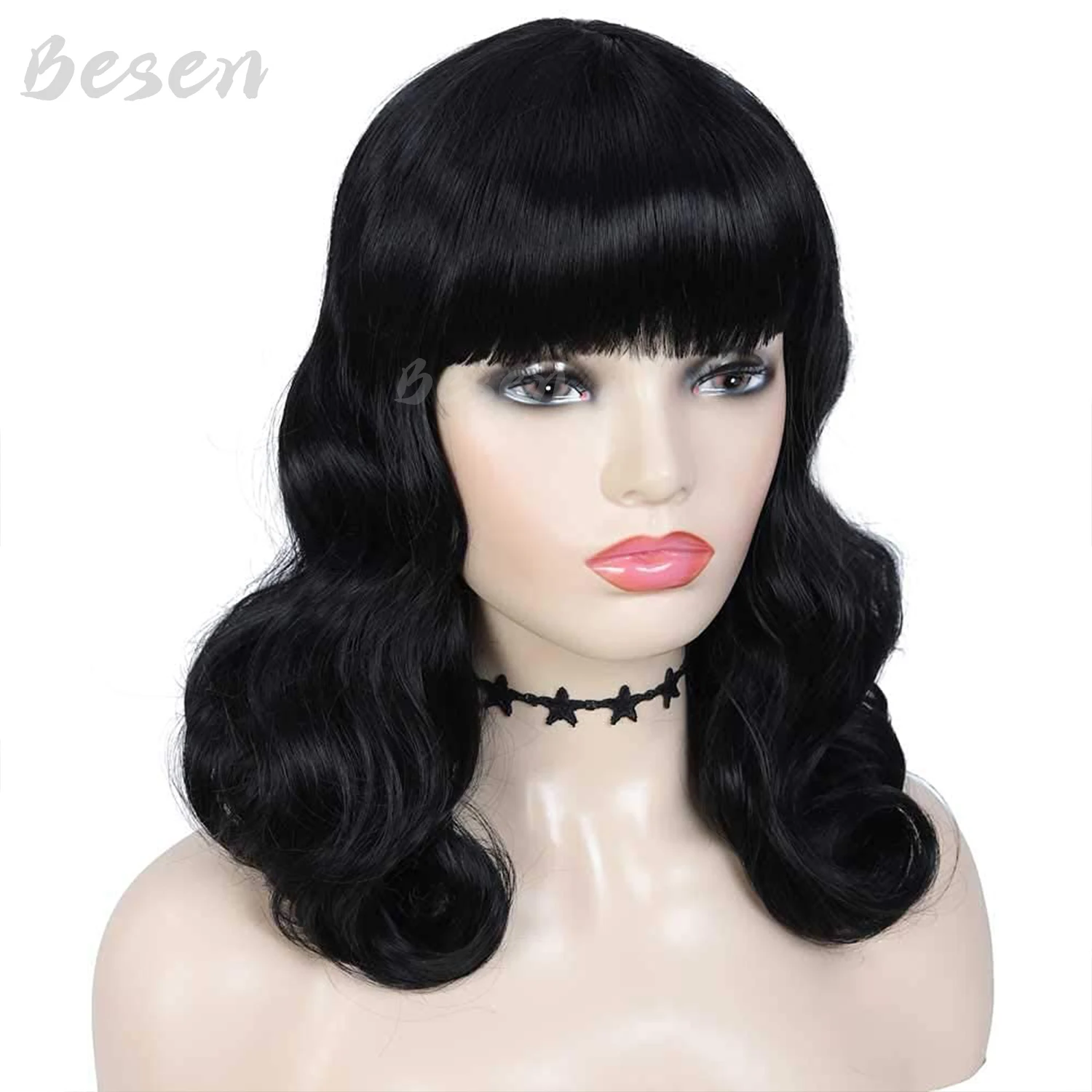 Synthetic 50s Vintage Shoulder Length Black Wigs with Bangs Bettie Page Wigs Natural Wavy Hair Wig for Women Cosplay Halloween