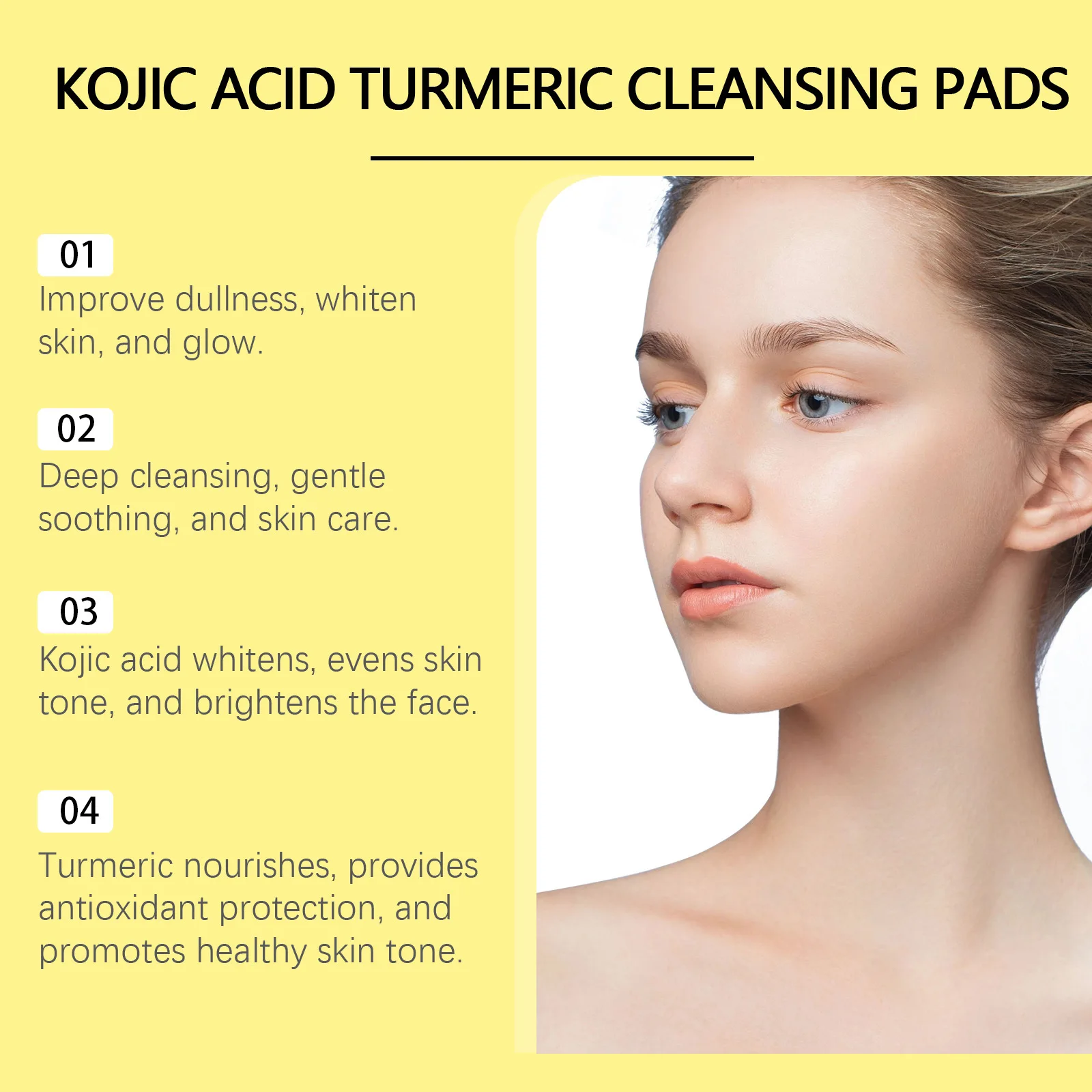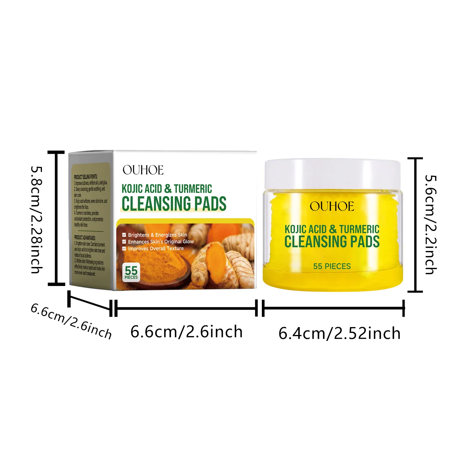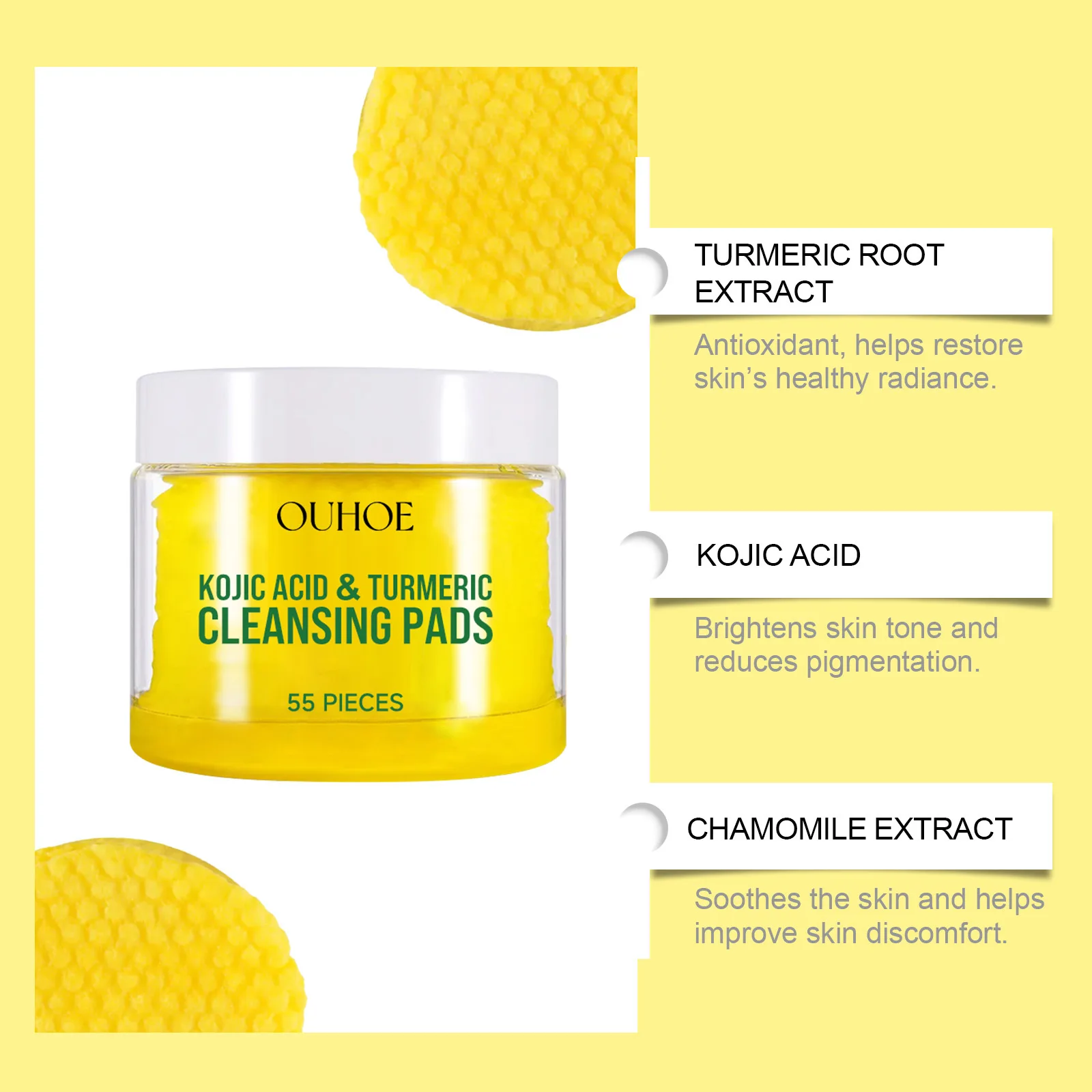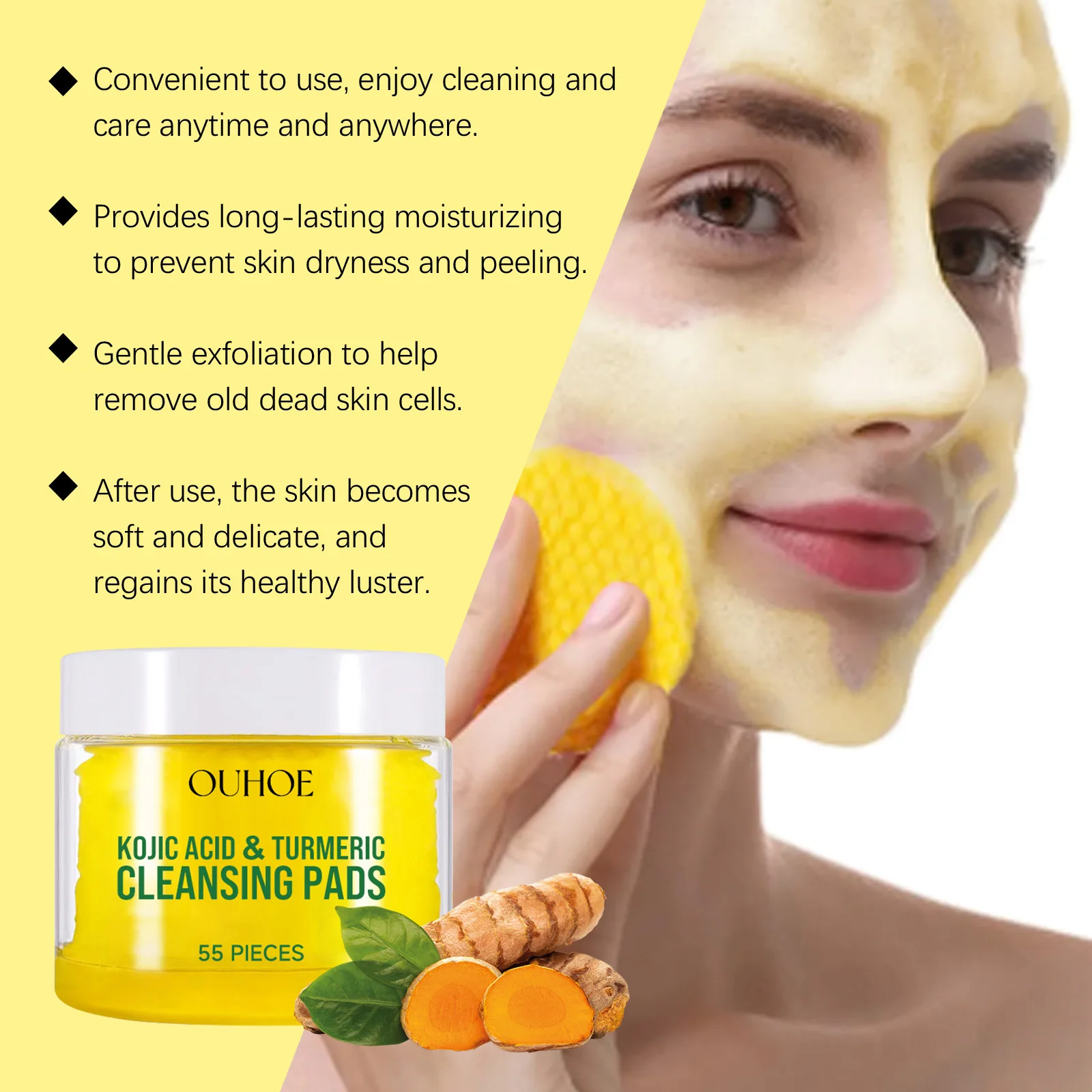OUHOE Turmeric Kojic Acid Facial Exfoliating Cleansing Pads Clogged Pores Oil Remover Glow Brighten Daily Lemon Facial Cotton Sponges 55pieces