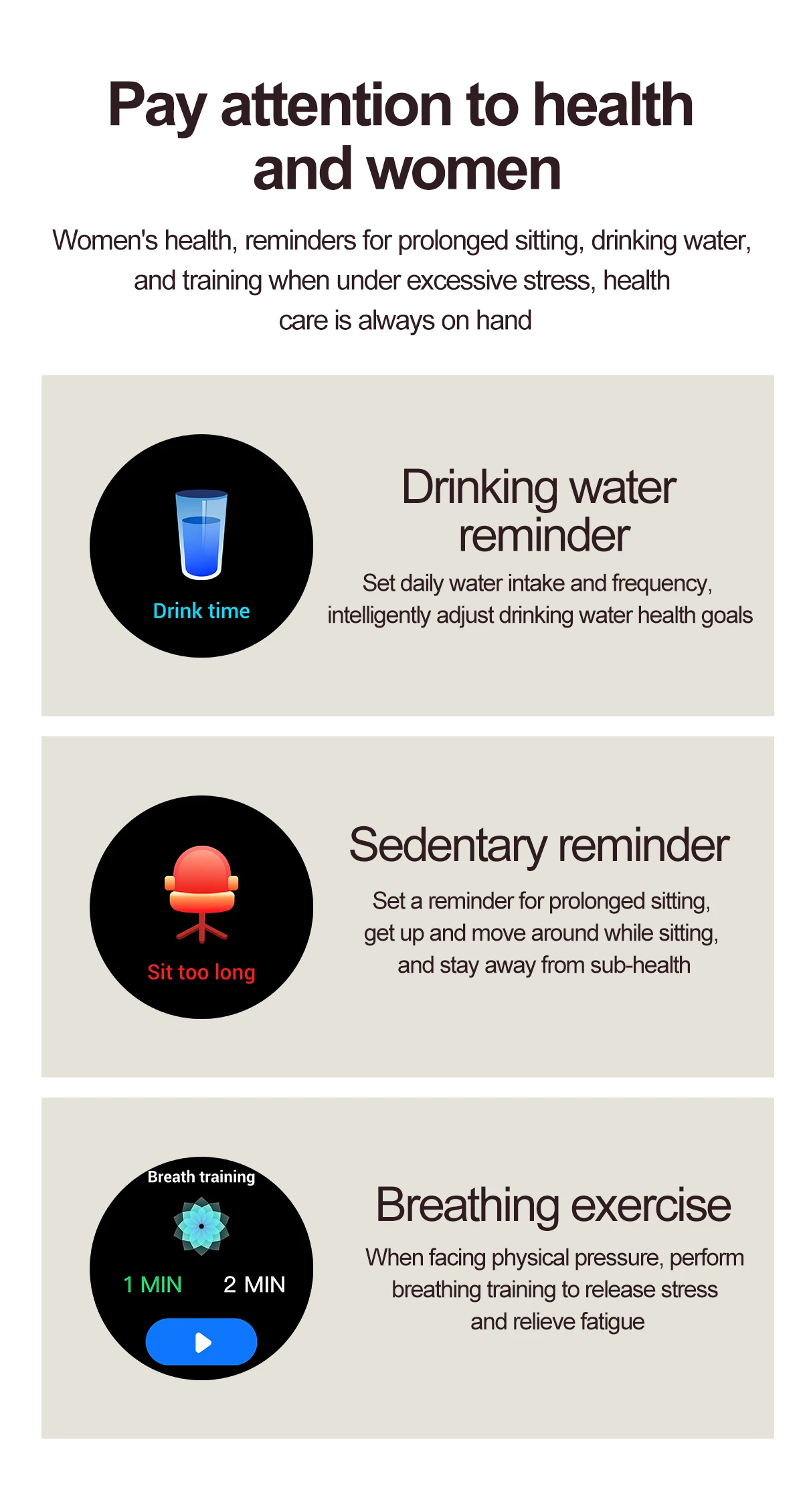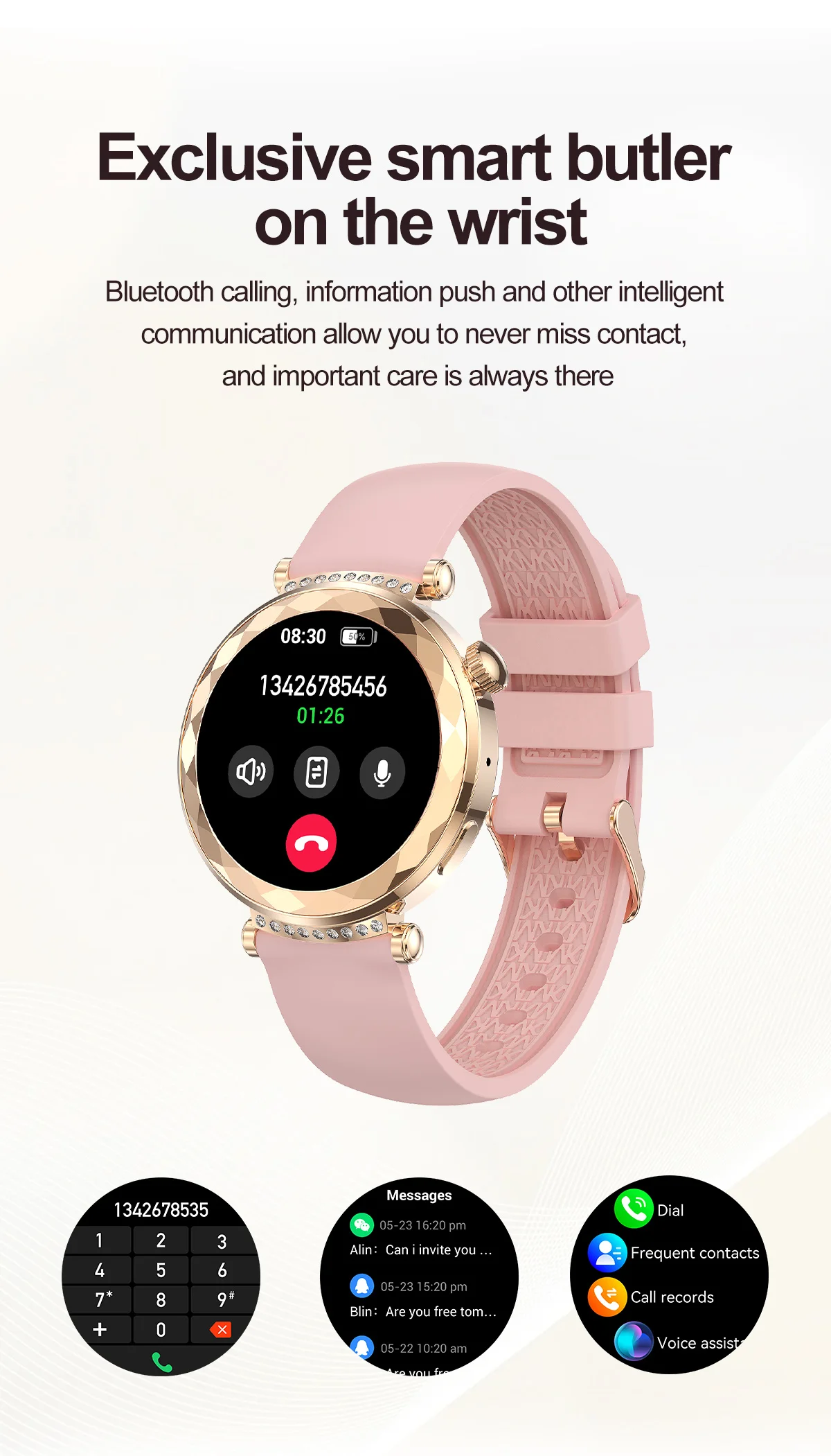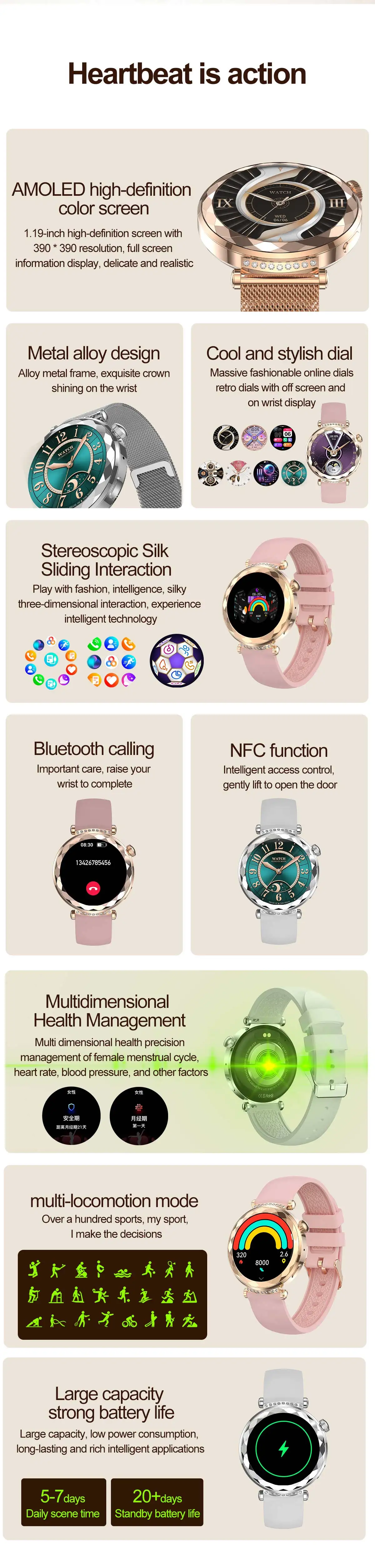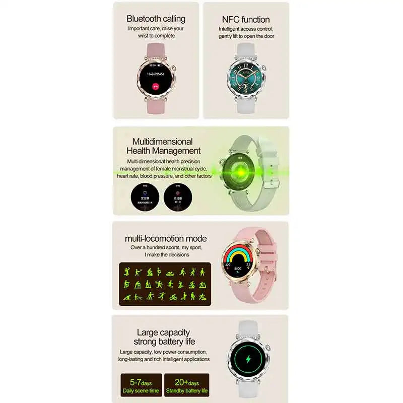 【Main Features】: Activity,Sleep monitoring,24-Hour Heart Rate Monitoring (Live Body Tracking) ,phone call(Recent call,Dial pad,Contacts,Answer call),Exercise, Multiple sports modes(Support 123 sports),Blood pressure monitoring, Spo2 monitoring ,Stree monitorirng,Messasge,Shutter,Music player,Relaxation, AI voice,Timer,Alarm,Stopwatch,Cycle tracking,Flashlight,Find Phone,