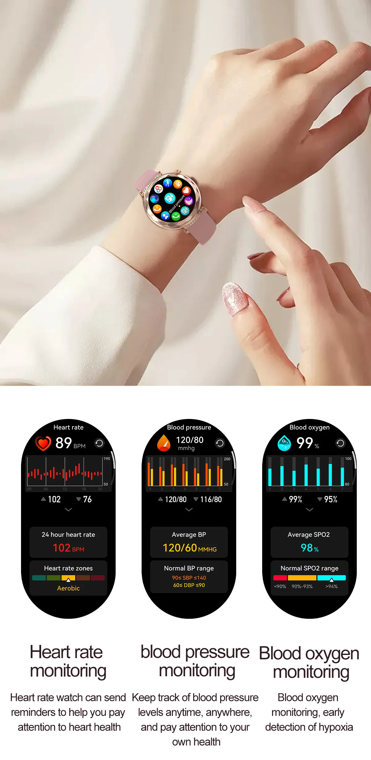 Metrics measured: Heart Rate Monitor,Blood Oxygen Monitor,Sleep Monitor,Blood Pressure Monitor,Stress Monitor