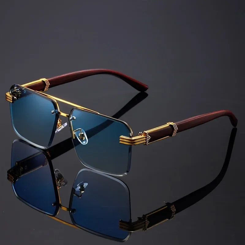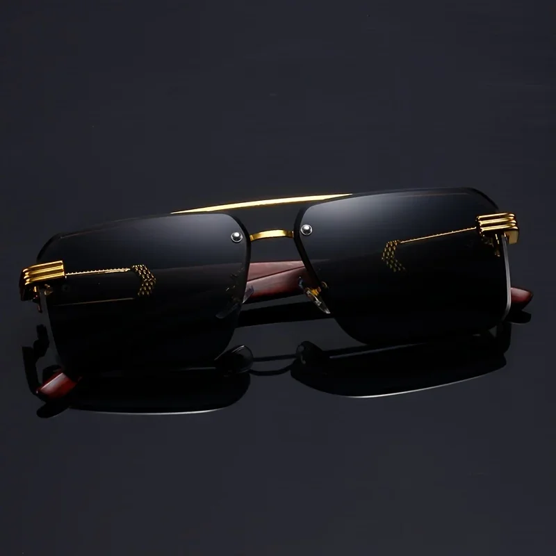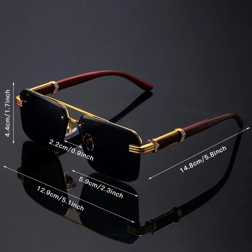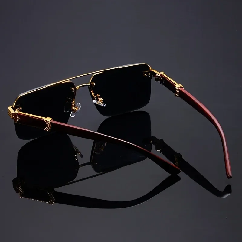 Women's Frameless Double Beam Fashion Sunglasses Golden Border Wood Grain Bracket for Male and Female Drivers Black Eyeglasses