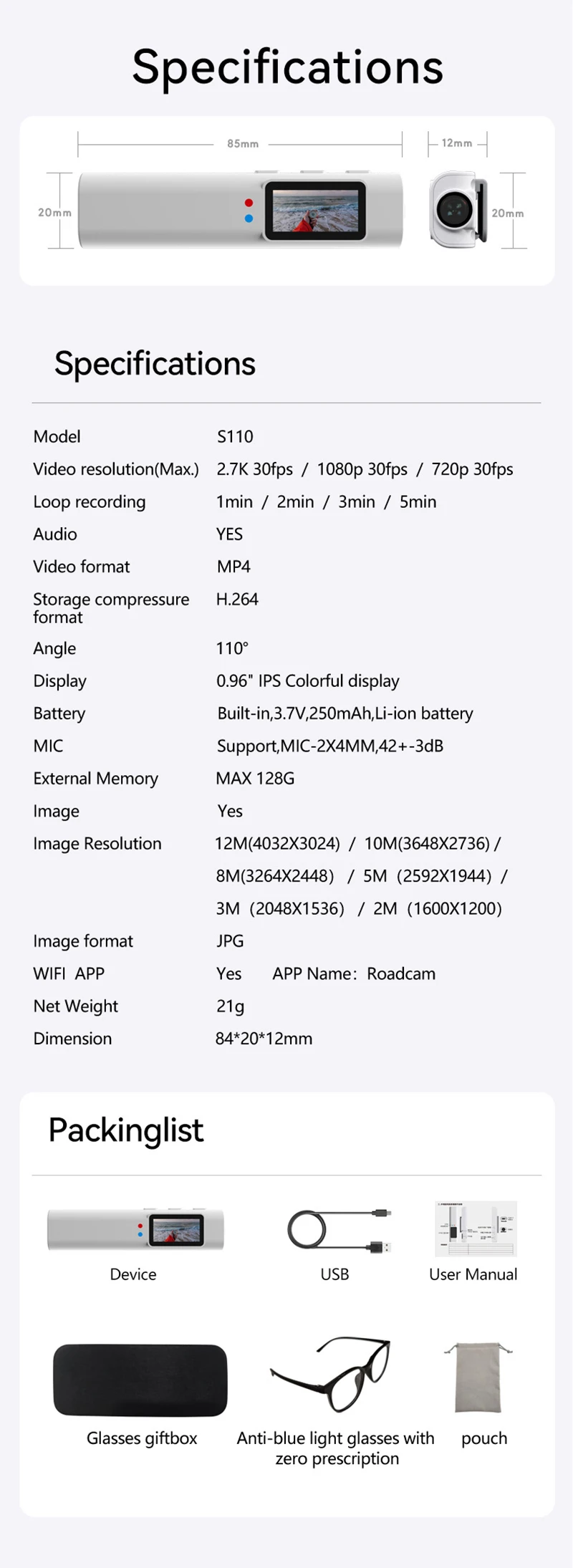 8. Camera angle: 110 degrees